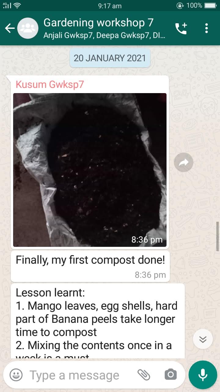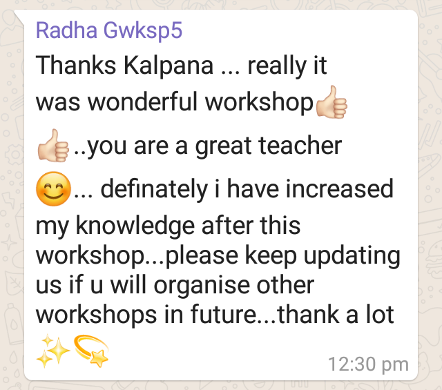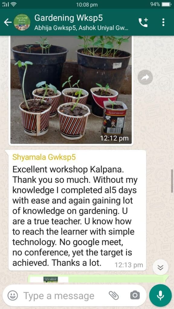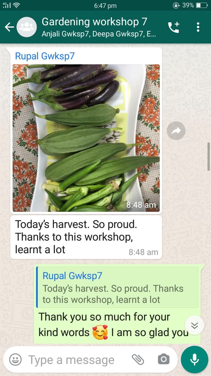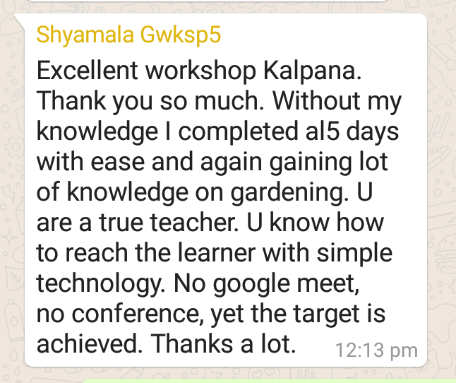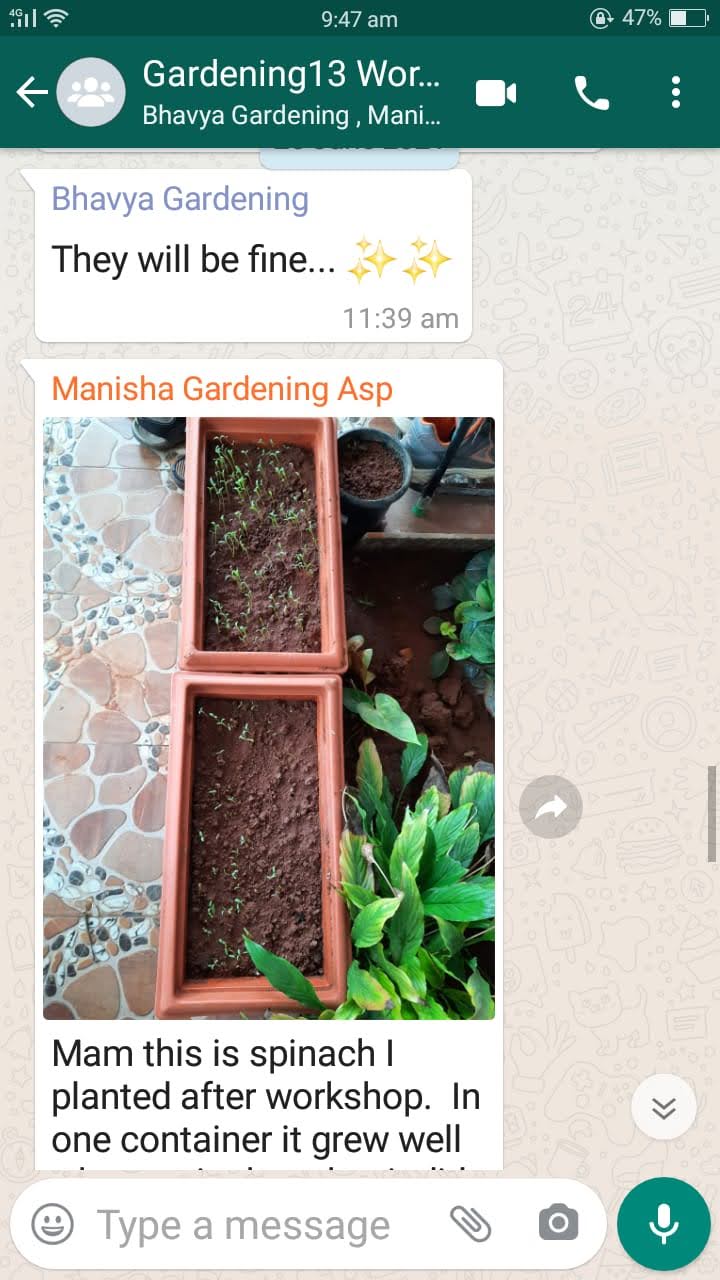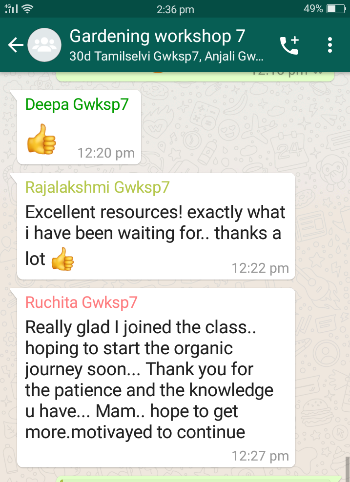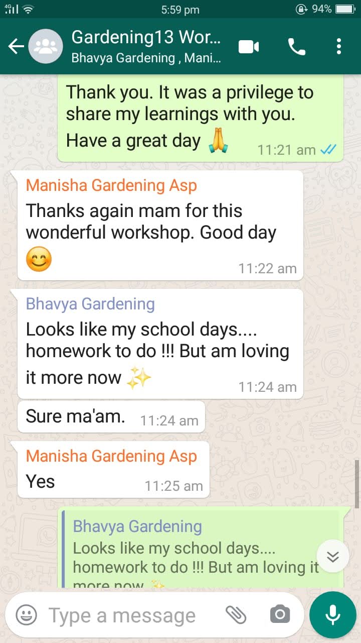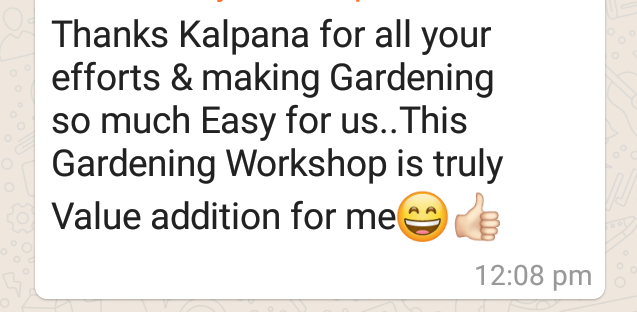 Great workshop for all age group, I have no knowledge in gardening. I am so happy that I had approached the right person. Mam teaches very nicely, clears all our queries so politely. And she will make sure whether we are clear with that query or not. Mam you are Epitome.