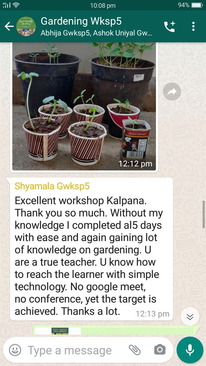 Great workshop for all age group, I have no knowledge in gardening. I am so happy that I had approached the right person. Mam teaches very nicely, clears all our queries so politely. And she will make sure whether we are clear with that query or not. Mam you are Epitome.